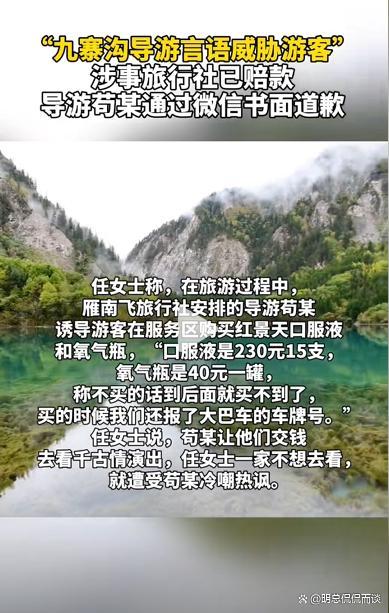 一名来自北京的游客称,她在九寨沟旅游时遭到导游的威胁。最新情况:旅行社涉及赔偿,导游微信道歉,当地文化和旅游局已回复其家人。谁知道?我本想带爸爸妈妈去九寨沟看看人间仙境,但导游差点告诉我,我们只是想在野外生存。北京任某一家去国庆旅游,导游却遭遇一系列刁难。先是像卖保健品一样强迫他买红景天口服液,然后又骂他不肯看演出,最后还把他堵在卫生间门口,威胁他别想回家。这位导游在哪里?显然是在《快点》上在fForce买卖的“高启强”所拥有的吧?今天我们必须要明确一点。普通人为什么要花辛苦钱靠旅行赚了钱,却成了待宰的羔羊?当任正非在抖音上看到“四川中国国际旅行社”的广告时,他万万没想到,这竟然变成了一部关于“王子与灵猫”的电视剧。为期三天的九寨沟旅游,每人1200元,广告页上印有国家背景的“金字招牌”。没想到,付了钱之后,合同却悄然变成了不知名的“杨南飞旅行社”!这个操作就像在官网订购一部iPhone,收到的却是华强北机型的复制品。你能应付得来吗?更令人震惊的是,豁免证书和承包商根本不符。任先生一家就像是被包装在拼兮兮盲盒里,9块钱,包邮。在打开盒子之前,你不知道里面的东西会让你惊讶还是震惊。事实上,这种“转售、团购”早已是旅游行业公开的秘密。尝试。一些大型旅行社依靠自己的品牌产生流量,然后将客户转售给较小的旅行社并收取佣金来赚取差价。这对游客来说是多么痛苦的事情啊!显然,我支付了头等舱服务的费用,但最终我却挤进了绿色皮革火车的硬座上。甚至安全也受到质疑。 Len先生的经历是决定性的。他并非特例。有多少人等到行程出了问题才发现自己成了“没妈的孩子”?雁南嗨游社也可称为“戏剧艺术家”。公司成立于2001年,法定代表人持股70%。这显然是一家私营公司,想要从全国旅游公司的流量中获利。这波生意很像朋友间的微信生意,标榜与明星PS照片“官方合作”,在消费者维权时玩“踢球”。请让我在这里问你一个问题。如果连合同的部分内容都能“证明”,那么游客的权利岂不是像高原上的氧气一样稀缺吗?最可悲的是,任先生直到维权后才意识到这一点。原来,她自始至终都和中国旅行社没有直接关系。我不禁感到脊背发凉。目前,短视频平台是受旅游广告影响最大的领域。 “认定为国有资产”、“禁止收购”的横幅后面,藏着多少这样的套娃陷阱?一出发,我们的导游苟先生就迫不及待地启动了“交通模式”。巴士停在某个服务区。我们的导游说:“高原反应会杀死你。”我一直说:“如果你不买,以后你会后悔的。”红景天口服液直接被宣传为“神奇的延年益寿药”。 15支230元,与茅台特产同价,氧气瓶40元一个是机场价格的三倍。更离谱的是购物时还要求登记车牌,但这如何预防高原反应呢?显然是为了防止有人“逃跑”吧?据网友反映,这些服务区的购物点通常与旅行社有关联。利润分享。导游对待游客就像“行走的洋葱”,用威胁性语言挑起恐惧,配合“限量”饥饿营销。组合拳打完之后,大人没办法,只好乖乖付钱。任先生和家人坚称不买,但郭主任立即不屑。场景是在直播间里。这和荒诞剧里“不点赞不送礼物,主播会说你可怜”很像。其实,为什么高原反应这么可怕呢?九寨沟最高海拔仅3100米,适合大多数健康人群出色地。如果确实需要准备氧气,可以在景区门口花20元买一罐。然而,领导人选择将服务区呈现为“供应端点”。这不就是利用数字鸿沟“杀人”吗?我告诉你,有些导游应该转去直播带货。如果这样做的话,我们甚至可能会创造超越李佳琪的销售记录。最让人血压上升的是,狗岛的绩效考核表上,清楚地标明了不同游客的旅游价格差异。长期以来,合著者将游客分为三类、六类或九类。那些财力雄厚的人和那些来得快的人,即红色的人,将受到照顾,而精打细算的人将被抛在后面。这里的导游在哪里?他显然正在玩真实版的“大富翁”游戏。郭导宣布拍《双世宠妃》时,任家人拒绝,ying:“我父母很累。”于是,导游的“逗逼技能”立刻就被激活了。 “舍不得花钱出去玩”、“别人家的老人玩得很开心”,这些都是深深触动人心的话语。现在看演出,难道不是成了一种“原罪”吗?难道旅行社也充当伦理审查委员会?据说,这些演出的门票里往往包含着导游的高额佣金。一张280元的门票,导游大约能拿到100元左右的佣金。 100 元。 难怪高总监对销售的热情比他自己的父母还要多。但为什么游客报名纯游后还要向导游支付KPI费用呢?更讽刺的是,当任先生因住宿条件不佳要求退还差价时,苟总监立刻一副“铁鸡”的样子,说道:“房间的价格就不能谈了吗?”无需购买食物即可游览菜市场?? ”他说。这种双重标准简直就是把游客当成卡其软了。如果你同意花钱,你就是“大神”,但如果你不肯买,你就是“抠门”。毕竟有些导游忘记了,你的工资是游客间接支付的。如果我得罪了所有的顾客,我是不是就得去景区表演令人心碎的表演来谋生?任女士的经历让我想起了一个著名的故事。 网上引用一句话:“我不是人民币,所以没人能喜欢我。”不过导游兄弟,你又不是秦始皇,没必要让车上的人都“跪谢”吧?这次旅行最神奇的部分发生在回来的路上。事实上,苟主任在高铁卫生间门口堵住了任先生,严厉地告诉他:“睡着之前别想回家。”的 要求! ''