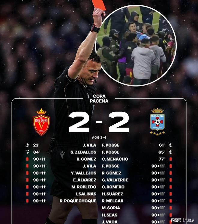 足球在南美洲的户外活动中占有特殊的地位。 11月26日,南美足坛又爆发暴力冲突。这个地方的混乱和工作人员的疯狂令人惊讶。对抗过程中,双方拳打脚踢,20名警察介入并使用催泪瓦斯。最终,共有17名球员和教练被开除。两天前,玻利维亚国家杯四分之一决赛第二回合,皇家奥鲁罗对阵布鲁明,皇家奥鲁罗主场作战。比赛中,两队各进两球。布鲁明首轮主场2-1获胜,以总比分4-3晋级半决赛。奥鲁罗主场输球。比赛结束后,布鲁姆球员们热情庆祝,奥鲁罗球员则带着巨大的悲伤离场。在此过程中,塞瓦略斯·德奥鲁罗被对手挡住,愤怒地推了他。另一名奥鲁罗球员胡利奥·比利亚上前击中了对手,立即引发了一场比赛。两支球队之间发生了巨大的冲突。在球员们互相厮杀的同时,两队的教练也面面相觑。布鲁明教练将奥鲁罗教练罗布雷多推倒在地,进一步激怒了奥鲁罗球员。随后,两队球员之间的竞争更加激烈。最后,布鲁明教练给球员们打电话,让他们冷静下来。据报道,共有20名警察参与维持现场秩序。警方不得不使用催泪瓦斯安抚球员,防止他们完全失控。在这个过程中,裁判也极力稳定球员的情绪。他总共出示了17张红牌,其中本地球队奥鲁罗队(7名球员+教练)有8张红牌,而客队布鲁明队(4名球员+教练+助理)则有9张红牌。裁判随后会将此事报告给纪律委员会,两支球队都可能会受到额外的处罚。
