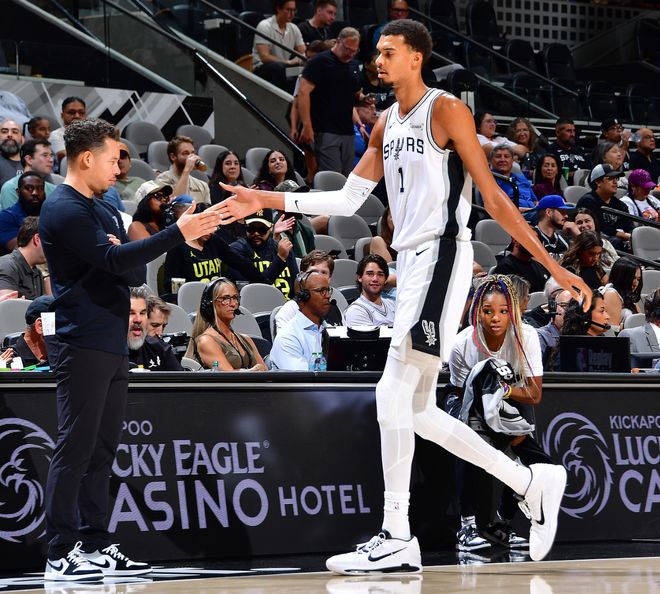 北京时间10月11日,圣安东尼奥马刺队进行了第三场季前赛。此前两场比赛分别对阵广州男篮和热火队。这场比赛的对手是犹他爵士队。马刺队新的二号秀迪伦·哈珀回来了。他将面对5号秀艾斯·贝利。这两位巨星的对决,依然被亚玛文邦的风格所掩盖。文班上场16分钟拿下22+7+3分。对于身高已经长到2米、26米的文赞来说,弄湿太容易了。他的运动能力是姚明的数倍。如果他在努尔基奇篮下遇到卡塞,他能解围就可以投篮。文班亚马还与哈珀联手完成了一次强有力的双手空中接力扣篮。这个进球让当地的热刺球迷兴奋不已。哈珀,身高1.96m的高个控卫,确实非常出色。比赛前16分钟,文班亚马10投6中,三分4中1,罚球10中9,得到22分7篮板3助攻1失误。他的投篮命中率为60%,三分球命中率为25%,真实命中率为76.4%,正负值为+13。今年的榜眼秀是迪伦·哈珀。他的左手拇指部分韧带撕裂,因此没有参加前两场季前赛。没想到,前18分钟,他6投4中,三分球3投1中,得到9分3助攻,零失误。他的投篮命中率为66.7%。他通过了两次空中接力,整体形势非常好。哈珀一回到Wembang Yama,他就打出了自己最强、最简单的比赛。要知道的是,文邦首节比赛3投3中得到9分10篮板7助攻6失误,在16分钟的时间内得到9分10篮板7助攻6失误。第二场比赛打了22分钟,他9投4中得到10分、5次助攻、4个篮板和5次失误。两场比赛失误11次,但文班仅本赛季失去了一名。这是哈珀的错。他不需要那么多时间来控球。增加你的接球和完成次数将提高你的投篮命中率并降低你的失误率。美国媒体PMB写道:在马刺撤回榜眼秀之前,在选秀之前,我就说过迪伦·哈珀将是邦赞的完美搭档。他们的比赛风格非常兼容,两人配合得很好。